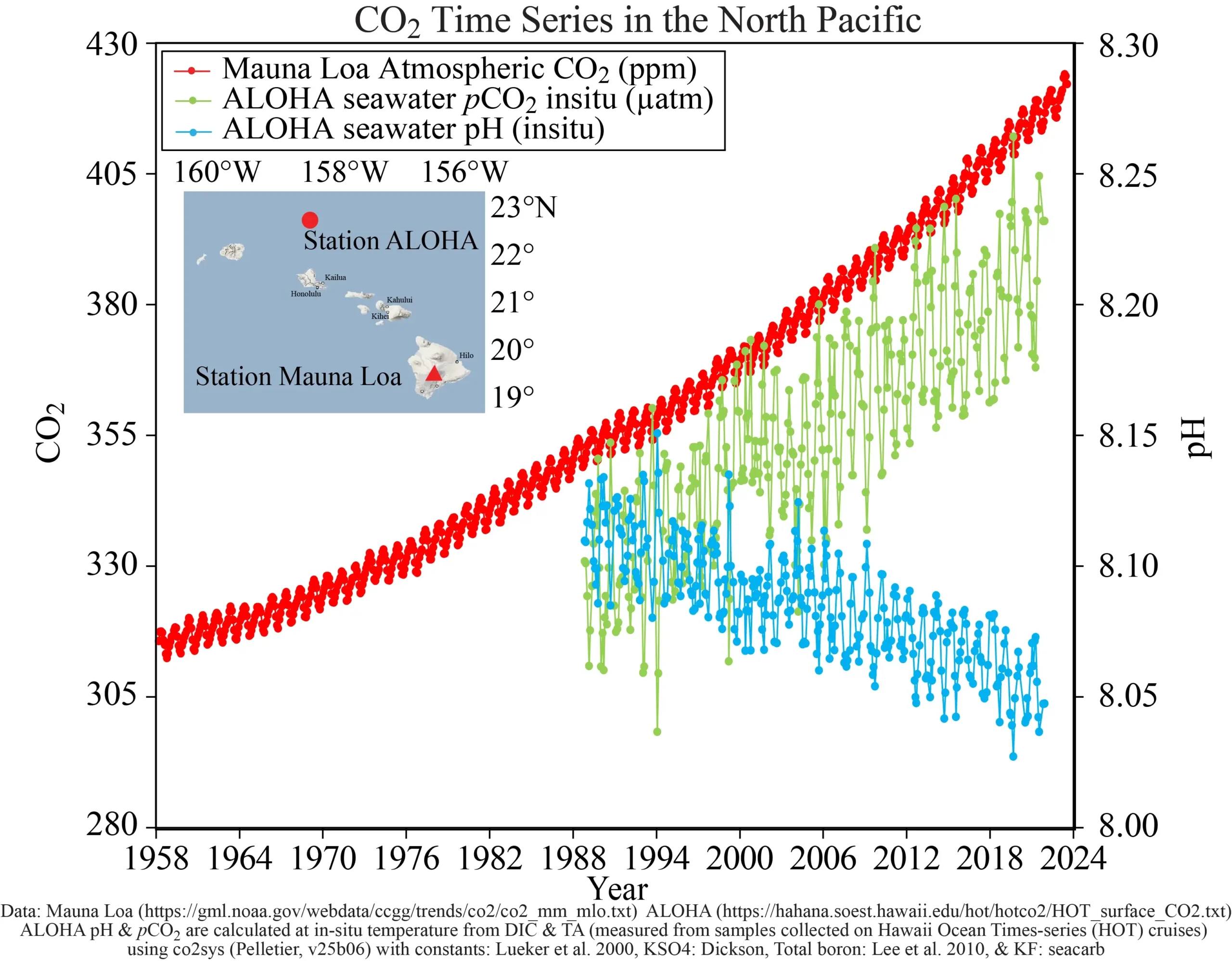 Ocean CO₂ and pH from NOAA: Correlation between rising levels of CO₂ in the atmosphere at Mauna Loa with rising CO₂ levels in ocean at Station Aloha. As the CO₂ increases, the pH decreases; indicating increasing acidificication.